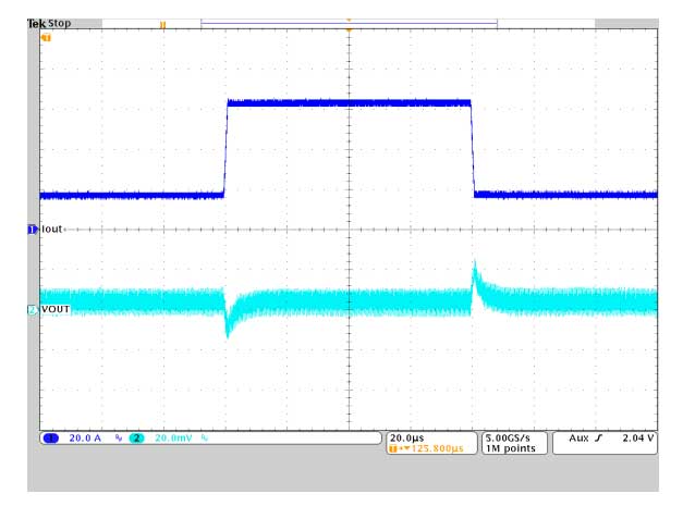 La possibilità di regolare la risposta ai transitori in base alle esigenze dell’applicazione consente una regolazione più rigorosa in caso di transitori più intensi rispetto a quanto è possibile fare con la precedente topologia DCS-Control e soddisfa i requisiti di processore esigenti come Jacinto J7 di Texas Instruments o EyeQ6 di MobileEye.  La Figura 3 mostra uno stack di tre convertitori buck TPS62876-Q1 che forniscono un transitorio di carico da 46 A, mantenendo la tensione di uscita entro ±2% del setpoint di 0,875 volt.
