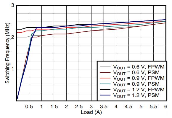Si tratta di prestazioni migliorate rispetto ad alcuni dispositivi in modalità corrente che mantengono la frequenza ma lasciano aumentare la tensione di uscita per soddisfare il tempo di attivazione minimo richiesto. Mentre sia il DCS-Control a frequenza fissa che il DCS-Control riducono la frequenza di commutazione allo stesso modo, il DCS-Control a frequenza fissa presenta meno condizioni operative durante le quali viene raggiunto il minimo on-time e la frequenza viene ridotta, a causa del suo on-time minimo inferiore.