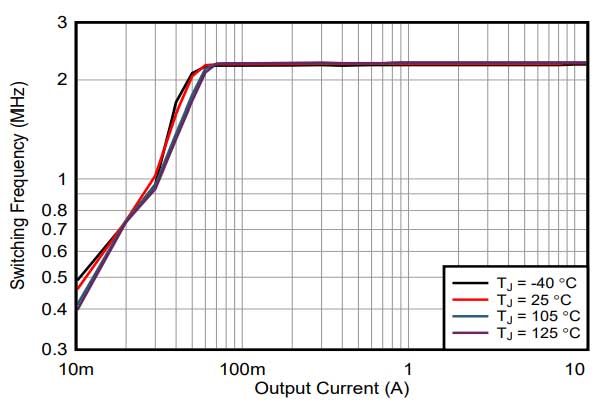 Figura 5. Variazione della frequenza di commutazione del modulo di potenza TPSM8287A12 con cDCS-Control a frequenza fissa.