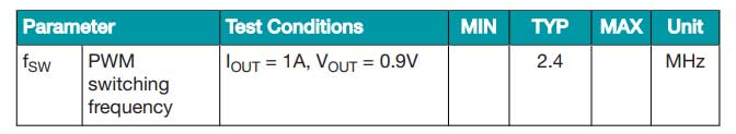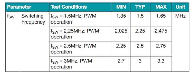 Tabella 2. Il TPS62869, utilizzando DCS-Control, specifica solo una frequenza di commutazione tipica.
