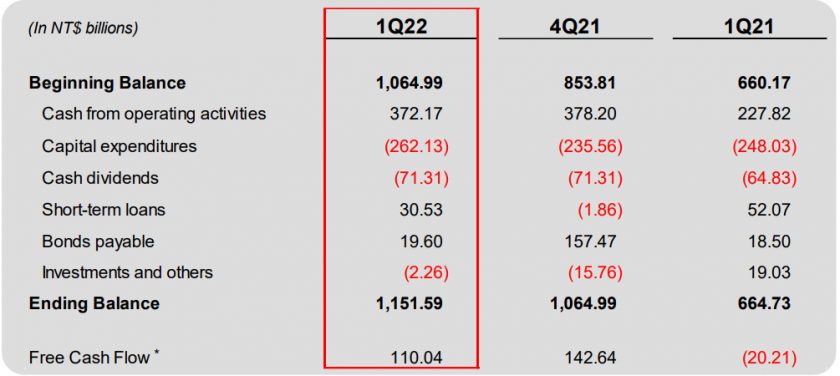 Nel primo trimestre TSMC ha generato flussi di cassa operativi per 372,17 miliardi di NT$, simili a quelli del trimestre precedente, ma in aumento del 64% rispetto al trimestre di un anno fa. Le spese in conto capitale, in pratica le spese per nuovi impianti ed attrezzature, sono state di 262,13 miliardi di NT$ (13,3 miliardi di dollari), in crescita rispetto ai trimestri precedenti.