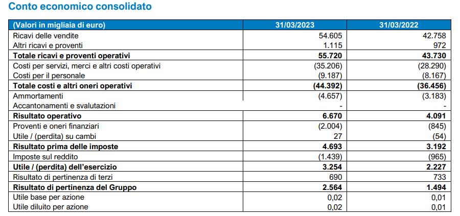 L’indebitamento finanziario netto adjusted passa da un debito netto pari a 118,8 milioni al 31 dicembre 2022 a un debito netto pari a 124,0 milioni al 31 marzo 2023. Tale variazione è legata prevalentemente ai maggiori oneri finanziari in considerazione dell’incremento dei tassi di interesse, oltre che alla crescita dei crediti verso clienti derivante dall’espansione del business.