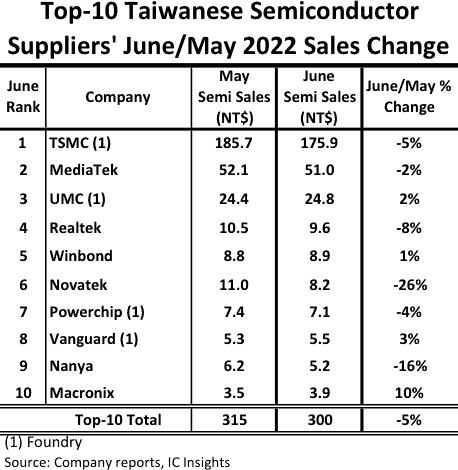 La figura 1 mostra i risultati delle vendite di giugno/maggio dei primi 10 fornitori di semiconduttori taiwanesi. In totale, queste 10 società hanno registrato un calo del 5% nelle vendite di semiconduttori di giugno rispetto a maggio, con tre delle quattro società più grandi, inclusa TSMC, che hanno registrato un calo.