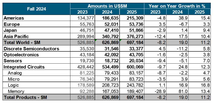 Boom per i circuiti logici e le memorie, male i discreti. A livello regionale, balzo degli Stati Uniti mentre arretra l’Europa. Il 2025 sarà un anno positivo per tutte le regioni e per tutti i prodotti.