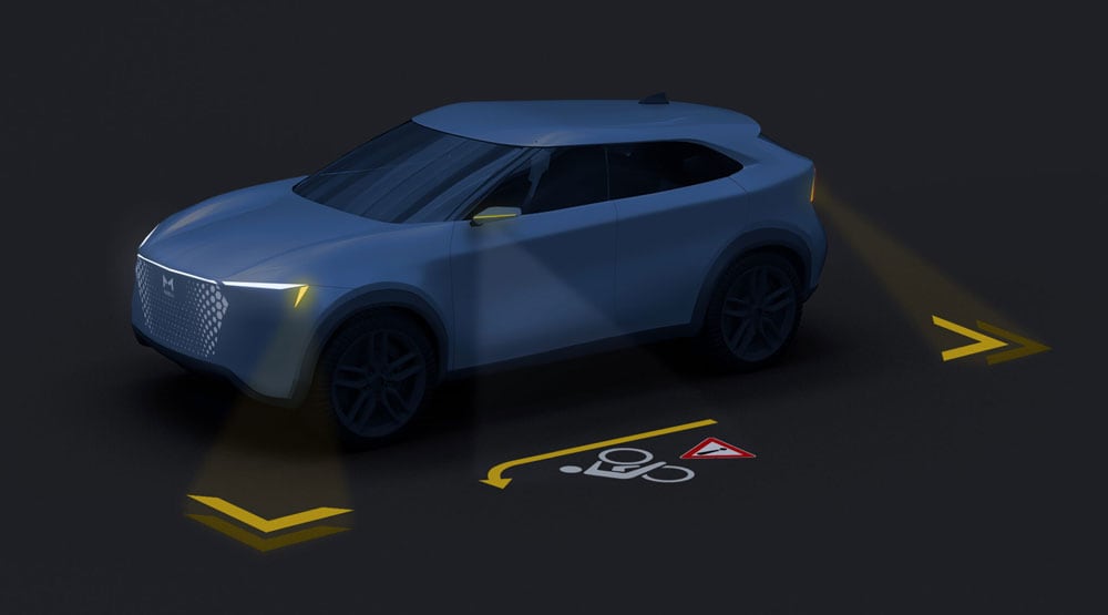 In ambito lighting, la tecnologia “Near-Field Ground Projections” (proiezioni a terra) espande le funzionalità di comunicazione e sicurezza al di fuori del veicolo.