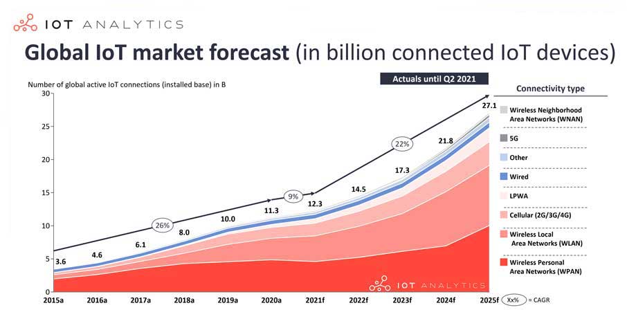 Sicuramente tutte le previsioni del mercato IoT si sono ridimensionate: rispetto ai 50 o 70 miliardi di endpoint previsti per il 2020, gli oggetti connessi a fine 2020 erano solamente 11,3 miliardi, la maggior parte dei quali di tipo WLAN (Wi-Fi e simili) e WPAN (Zigbee, Bluetooth, Thread, ecc.), come si vede in questo grafico dove sono indicate anche le previsioni di crescita per i prossimi anni.
