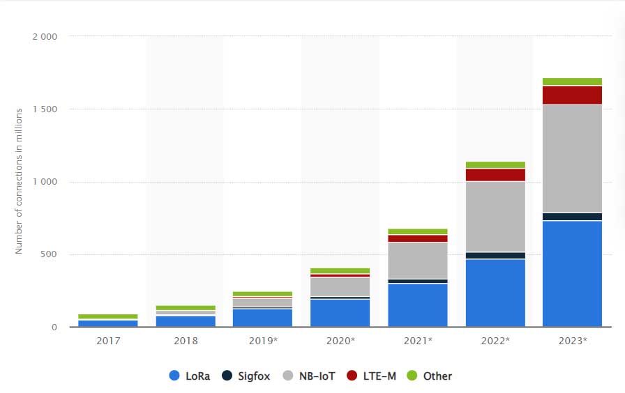 Per quanto riguarda il mercato delle connessioni LPWA, quello che riguarda Sigfox, una importante fetta è stata sicuramente erosa dall’arrivo delle tecnologie LPWA licensed (NB-IoT, LTE-M, ecc.) che attualmente valgono circa il 50% del mercato.