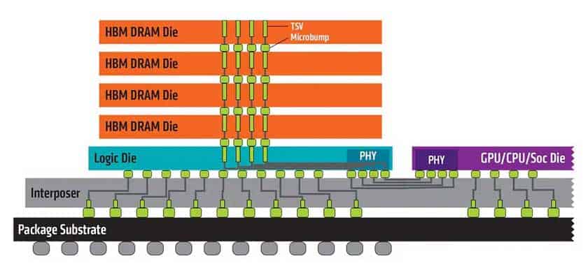 Le due società si concentreranno innanzitutto sul miglioramento delle prestazioni del die di base utilizzato nella parte inferiore del package HBM. L’HBM è realizzato impilando un die core DRAM sopra un die base che utilizza la tecnologia TSV (Through Silicon Via) per collegare verticalmente il chip logico di base a un certo numero di strati DRAM. Possono esserci migliaia di TSV pass-through a seconda del design del chip. Il die di base situato nella parte inferiore è collegato alla GPU che controlla l’HBM.