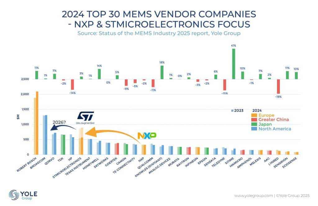 Secondo gli analisti di Yole Group, l’acquisizione è destinata a ridisegnare la classifica dei principali fornitori di MEMS a livello globale. Se nel 2024 NXP occupava la tredicesima posizione nella classifica dei 30 maggiori fornitori di MEMS, l’integrazione del suo business in STMicroelectronics spingerà quest’ultima al terzo posto globale, appena dietro al leader Bosch.