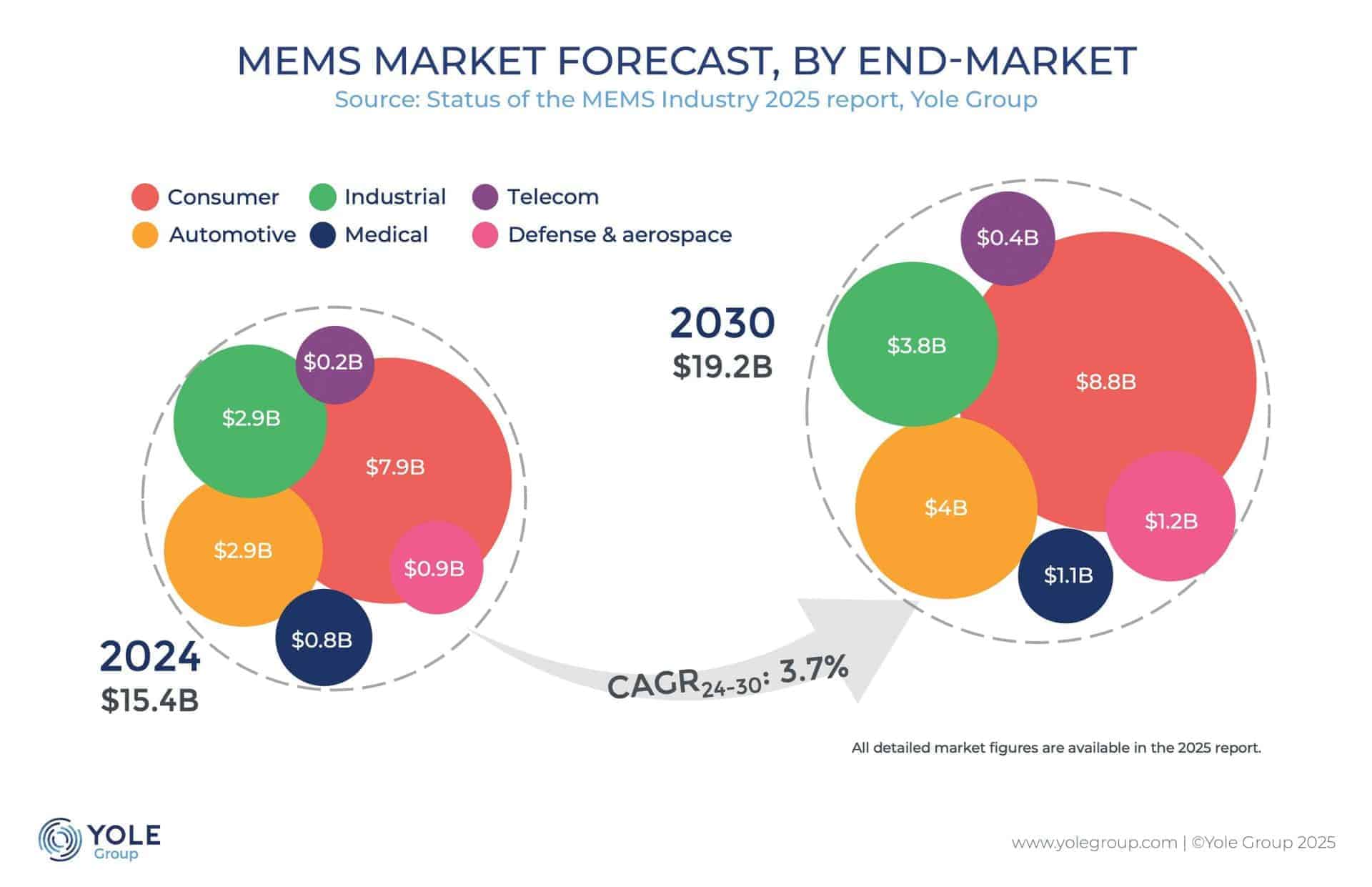 Il mercato globale dei MEMS ha registrato una ventata di aria fresca nel 2024, con un fatturato stimato a 15,4 miliardi di dollari (+5% su base annua) e con un CAGR 2024-2030 del 3,7%, come evidenziato dalla recente analisi di Yole Group Status of the MEMS Industry 2025.
