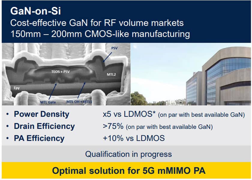 RF GaN-on-Silicon offre un elevato potenziale per l’infrastruttura 5G e 6G. Questo settore, in particolare quello degli amplificatori di potenza RF, è dominato dalla tecnologia LDMOS (laterally-diffused metal-oxide semiconductor). Le soluzioni GaN possono offrire caratteristiche RF migliori e una potenza di uscita significativamente maggiore rispetto ai dispositivi LDMOS. Inoltre, questi dispositivi possono essere prodotti su wafer di silicio o carburo di silicio (SiC). La tecnologia RF GaN-on-SiC può essere più costosa a causa del maggior costo dei wafer SiC per alta potenza e per i bassi volumi di questi processi. D’altra parte, la tecnologia GaN-on-Si in fase di sviluppo da parte di ST e MACOM dovrebbe offrire prestazioni competitive abbinate a grandi economie di scala, rese possibili dalla sua integrazione nei flussi di processo standard, simili a quelli CMOS. Della tecnologia RF GaN-on-Silicon ha anche parlato Remi El-Ouazzane, President, Microcontrollers & Digital ICs Group di STMicroelectronics durante il recente Capital Markets Day della società, evidenziando i vantaggi di questa tecnologia in termini di prestazioni e di semplicità costruttiva.