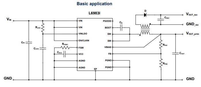 L6983i è adatto per applicazioni che richiedono un convertitore DC-DC isolato. Implementa una topologia iso-buck, che utilizza un minor numero di componenti rispetto a un convertitore flyback isolato convenzionale e non richiede accoppiatori ottici, risparmiando costi di distinta base e spazio su PCB.