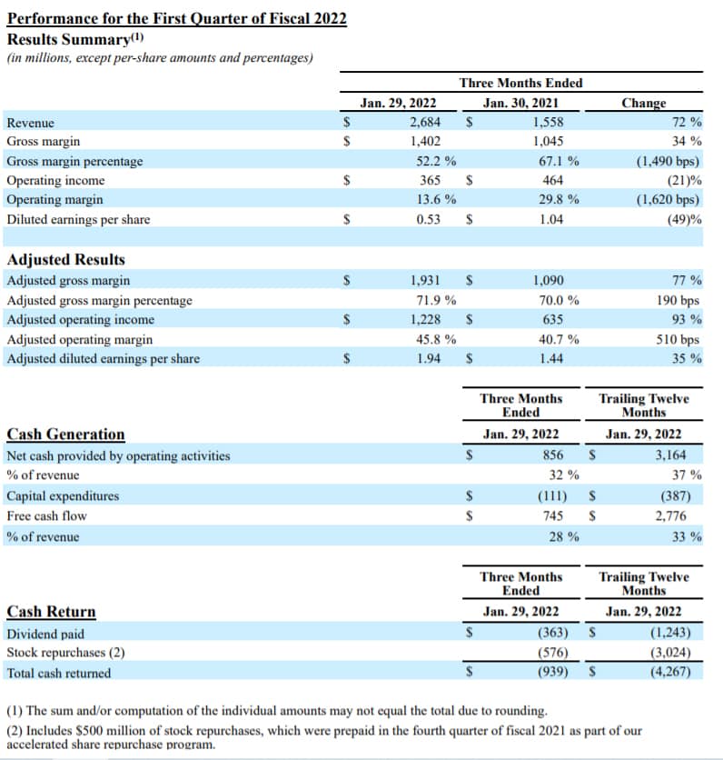 Per il primo trimestre fiscale 2022, il flusso di cassa operativo della società è stato di 856 milioni di dollari (3,16 miliardi negli ultimi 12 mesi), mentre è stato registrato un flusso di cassa libero di 745 milioni (2,78 miliardi negli ultimi 12 mesi).