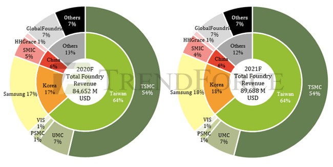 Il seguente grafico di TrendeForce evidenzia la quota di mercato mondiale dei produttori che realizzano chip per conto terzi:
