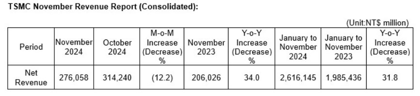 Ciò porta le vendite complessive del periodo gennaio-novembre 2024 a 2,616 trilioni di NT$ pari a 81,00 miliardi di dollari USA, in crescita del 31,8% rispetto ai primi undici mesi del 2023.